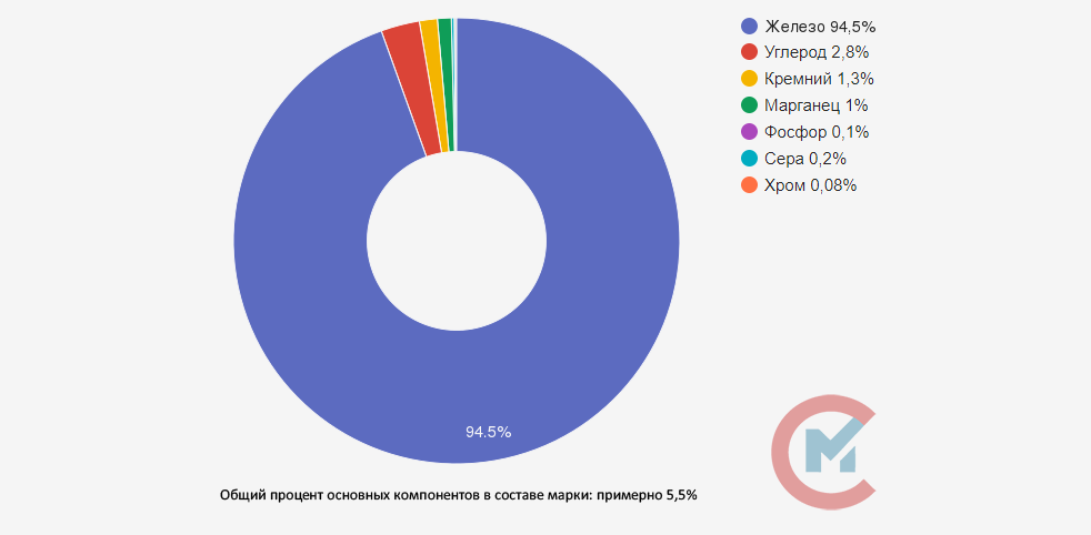Согласно ГОСТ 1215-79, в состав КЧ50-5 входят следующие добавки: углерод, кремний, марганец, фосфор, сера и хром. Данные элементы представлены в небольшом количестве, но необходимы чугуну для увеличения прочности, литейных свойств и окалиностойкости. Основой сплава является железо, наибольшей добавкой – углерод.