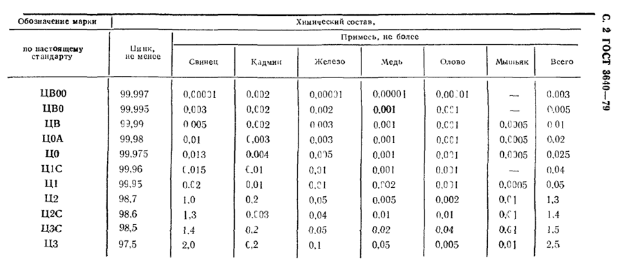 Цинк марки Ц3С — это металл, который содержит цинк в количестве не менее 98,5%. Состав примесей должен соответствовать стандарту и регламентирован в ГОСТ 3640-79. В новой редакции ГОСТ 3640-94 марки нет, и она не рекомендуется к производству.